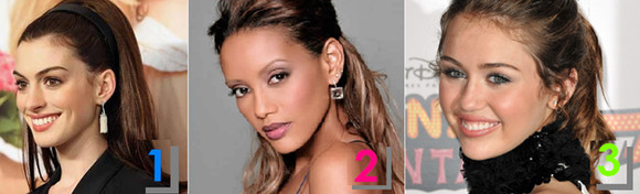 3- Aqui a Miley puxou o cabelo completamente para trás e atou-o. E também soltou umas pontinhas do cabelo.