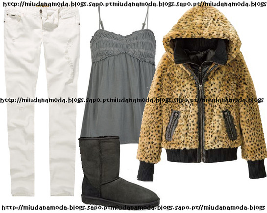 Para obteres este look conjuga umas skinny jeans brancas (billabong), um top babydoll (billabong), um casaco de padrão leopardo (pull and bear) e umas botas UGG.
