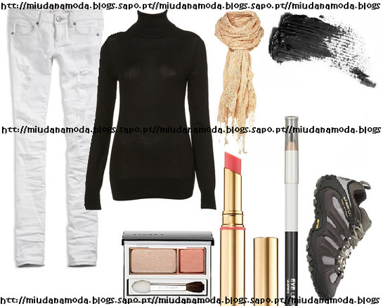 Para obteres este look é bem mais simples, conjuga umas skinny jeans (é de marca estranjeira mas encontras bem pareidas em qualquer loja de roupa) , uma camisola de gola alta (topshop), lenço (topshop) e umas sapatilhas de montanha (merrel).